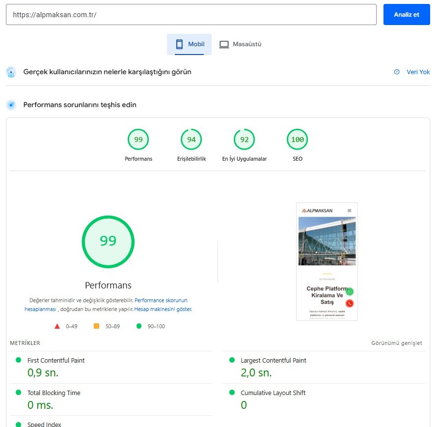 Fotoğrafta Google ‘ un kendi web sitesi olan pagespeed.web.dev sitesinden alınan bilgiler yer almaktadır. Yapmış olduğumuz web sitemiz 100 üzerinden 99 puan alarak olabilecek en iyi puanlardan birini almıştır. Bu ve ayrıca yapmış olduğumuz bir çok SEO işlemlerinden kaynaklı Google üzerinde en önemli anahtar kelimede 1. sırada çıkmaktayız.