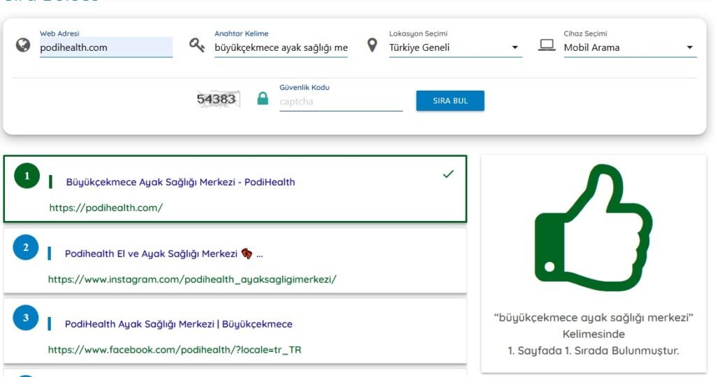 Aynı şekilde bu site de aynı veri alanından alınmadır ve 100 üzerinden tam puan almıştır. Ayrıca büyükçekmece ayak sağlığı merkezi, silivri ayak sağlığı merkezi, büyükçekmece podolog gibi firmanın bulunduğu konumda da birinci sırada çıkmaktadır.